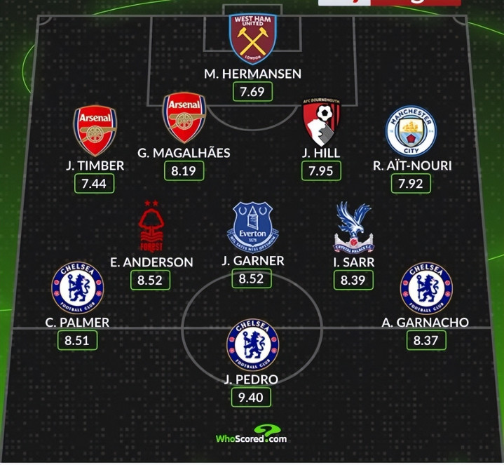 数据网站Whoscored评比出本轮英超最好威望,切尔西前场三东谈主组帕尔默、佩德罗和加纳乔同期入选。完满威望为:门将赫尔曼森(西汉姆);后卫廷伯(阿森纳)、加布里埃尔(阿森纳)、希尔(伯恩茅斯)、努里(曼城);中场安德森(诺丁汉丛林)、加纳(埃弗顿)、萨尔(水晶宫);先锋帕尔默(切尔西)、佩德罗(切尔西)、加纳乔(切尔西)。