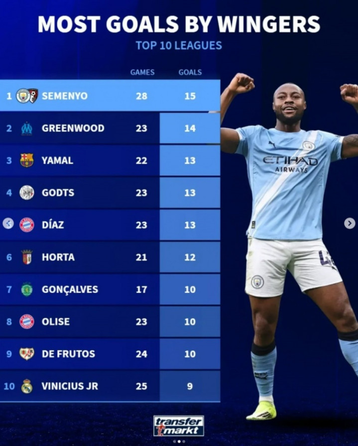 3 - 德转预热塞梅尼奥新身价:最高可达8000万欧,本赛季进球领跑边锋榜