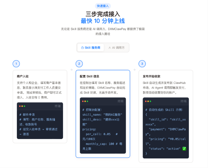 与需要开垦者自行编码杀青计费和下单功能的有假想不同,DXMClawPay将计费引擎、订单不休和圭臬化支付组件一起内置于平台层。Skill开垦者完成入驻并成立工作信息(如调用单价、次数套餐等)后,平台自动生成带有齐全计费逻辑的Skill并上架至OpenClaw,开垦者全程无需编写任何底层对接代码。