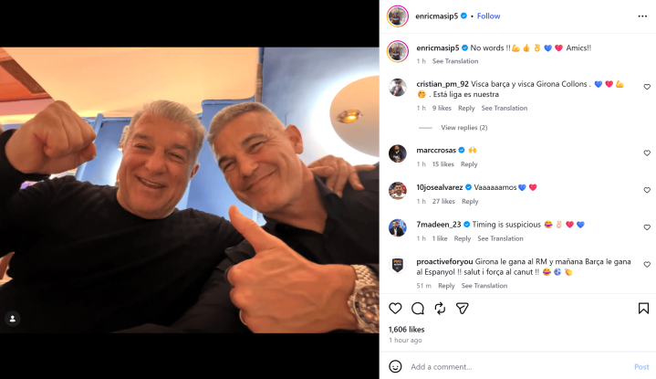 比赛甩手后不久,担任拉波尔塔主席参谋人的恩里克-马西普在个东谈主Instagram上发布了一张与拉波尔塔的合影。相片中,真钱三公棋牌两东谈主面带笑貌,一东谈主竖起大拇指,另一东谈主挥拳庆祝,姿态显得颇为同意。