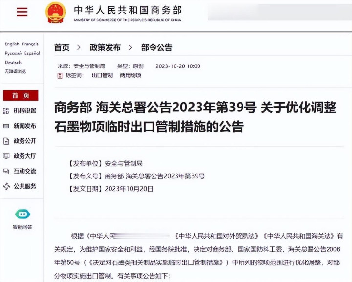 我们把时代拉回到2023年。那年10月17日,好意思国商务部长雷蒙多告示进一步收紧对中国芯片的限度。三天之后,也即是10月20日,我们的商务部和海关总署荟萃发布公告。公告写得很明确:从2023年12月1日起,自然鳞片石墨未经许可不得出口。你卡我的芯片,我就管住石墨。大国之间的博弈,即是这样径直。