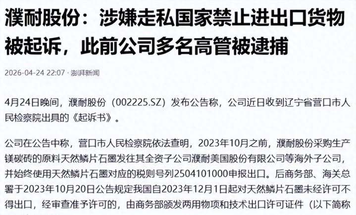 2026年4月24日晚上,A股上市公司濮耐股份发了一份公告。这份公告的骨子,看完之后让东谈主气得牙痒痒。公司和几名中枢高管,被营口市东谈主民搜检院致密告状了。罪名是私运国度不容收支口的货色。涉案物质是自然鳞片石墨,所有1243.55吨,金额598.47万元。这个音讯一出来,网上骂声一派,股吧里更是群情激怒。