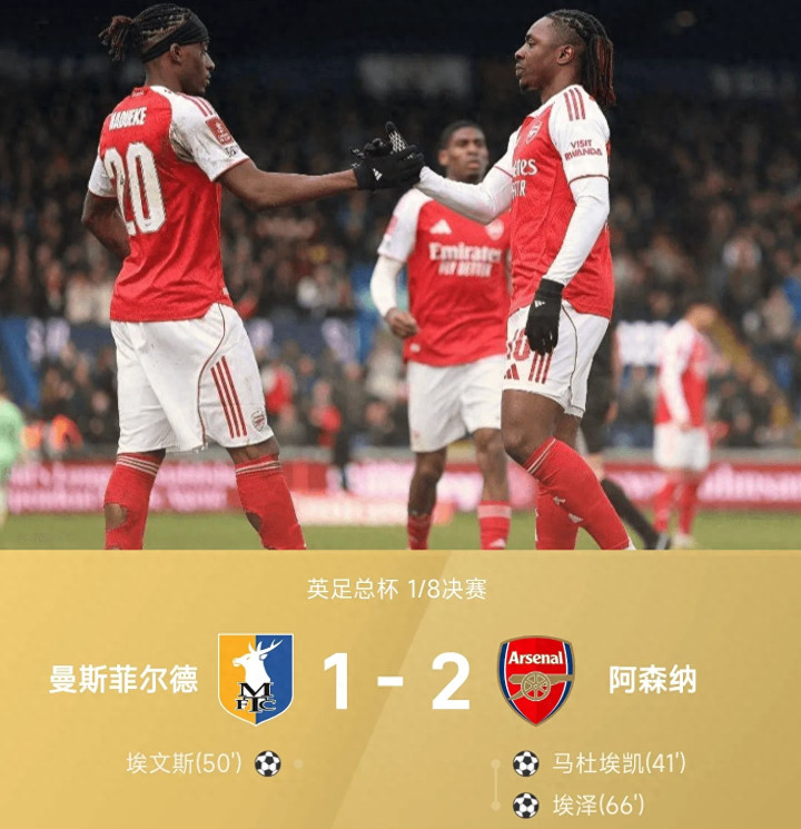 最终全场比赛已毕,阿森纳2-1客场驯顺曼斯菲尔德,收效晋级足总杯八强。