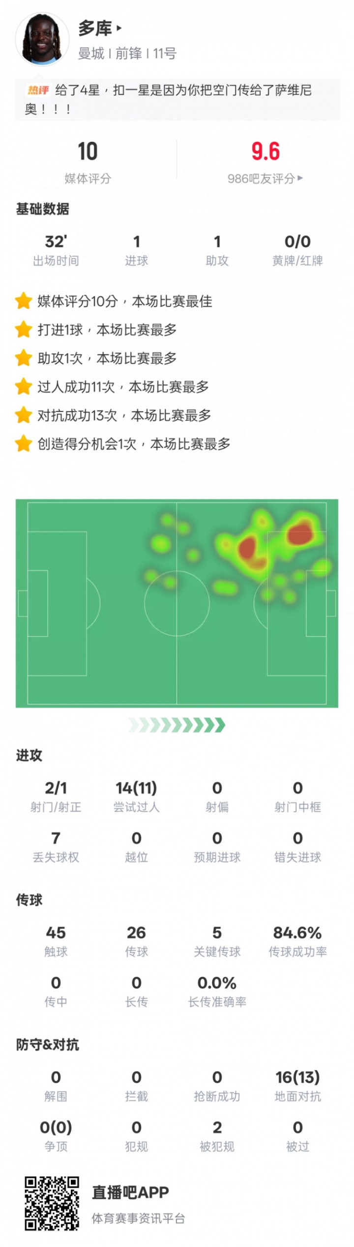 直播吧4月26日讯足总杯半决赛,曼城2-1南安普顿。多库下半场替补登场,在32分钟的上场本领里周转球队,孝顺1球1助攻,真钱三公11次过东谈主告捷,送出5次关键传球,获评10分。
