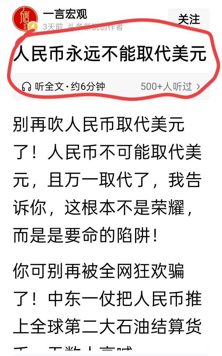 音书一出,全网对于“东谈主民币能否取代好意思元”的争论澈底炸锅。点开各大短视频、图文平台,一众博主纷繁以“感性暴露”的姿态发声,不雅点高度斡旋,话术更是如出一辙,像是斡旋复制粘贴而来。