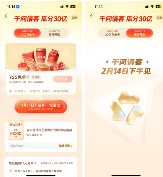 千问遴荐“场景深耕与什物免单”路线,以“30亿元春节宴客贪图”切入土产货活命。其中枢权柄是25元免单卡,用户只需语音说出“千问帮我点奶茶”,即可完成核销。为撬动拉新,平台设立“邀请新用户再得1张”的机制,最高可累计20张。