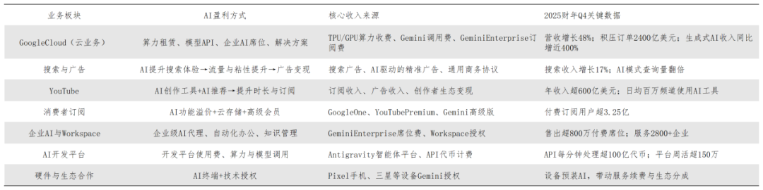 财报数据自大,2025财年谷歌总营收同比增长15%至4028.36亿好意思元,净利润同比增长32%至1321.7亿好意思元,净利润率高达32.8%。这一亮眼得益的中枢,在于谷歌构建了“自研芯片→云基础设施→大模子→全场景应用→多元变现”的垂直一体化AI盈利链:在C端,AI优化搜索体验,带动搜索告白收入同比增长17%;依托Gemini功能溢价,Google One、YouTube等订阅做事付用度户突破3.25亿,YouTube全年告白+订阅收入超600亿好意思元;Gemini月活达7.5亿,为高阶功能订阅奠定了坚实基础。