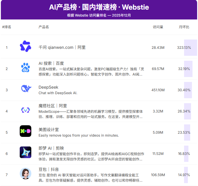 另一方面,行业竞争呈现明显的梯队相反:字节靠速率制胜,阿里开源生态建壮但C端入场偏晚,腾讯则借助DeepSeek与微信生态快速追逐。AI居品榜数据自大,2025年12月千问以323.13%的环比增长率大幅当先豆包的14.97%,但其28.43M的走访量与豆包的106.59M仍存在明显差距。