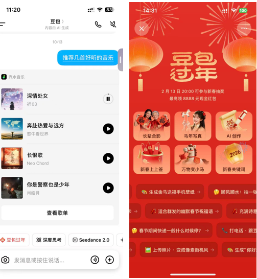 在居品端,用户通过“豆包过年”专区体验穿搭指导、新春案牍生成、AI父老合影等功能,即可参与抽奖,最高可领取8888元现款红包。