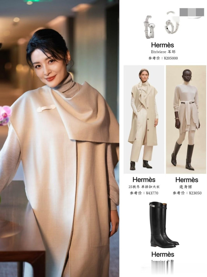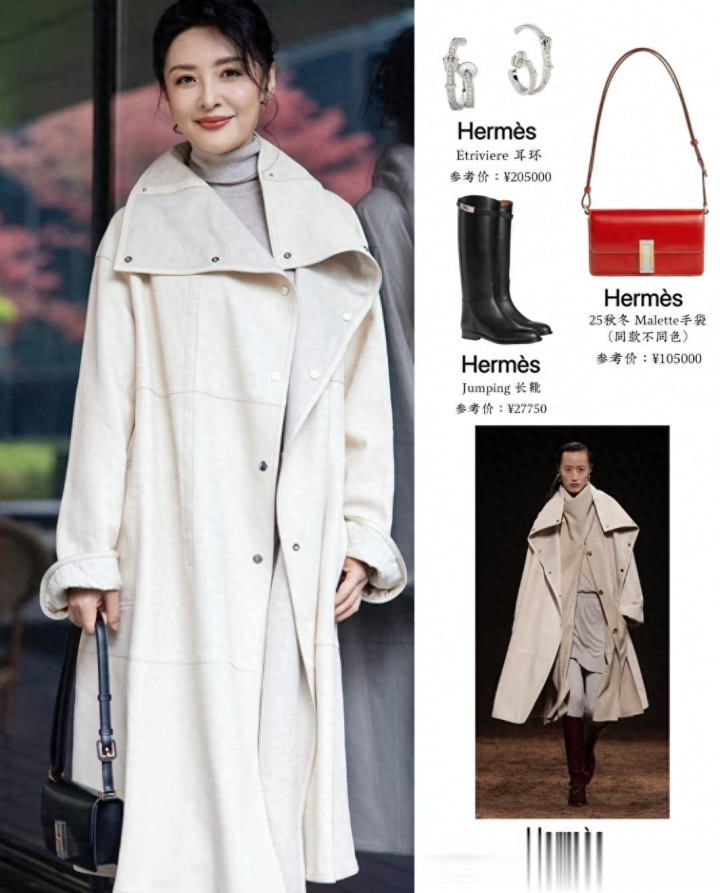 另一套浅卡其色无袖大衣配连身裙,加上同款耳饰和长靴,米兰体育两套加起来超80万,全是爱马仕顶级系列,排面扫数。