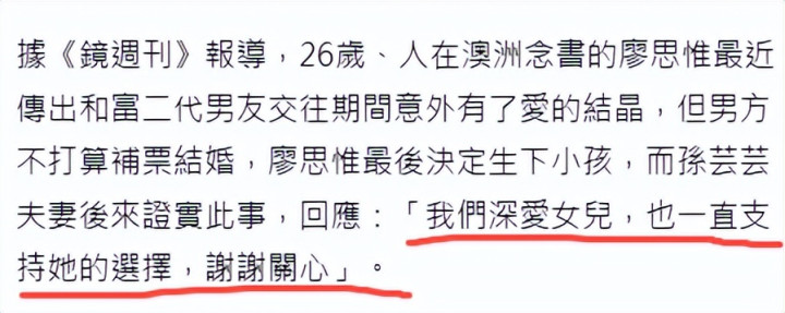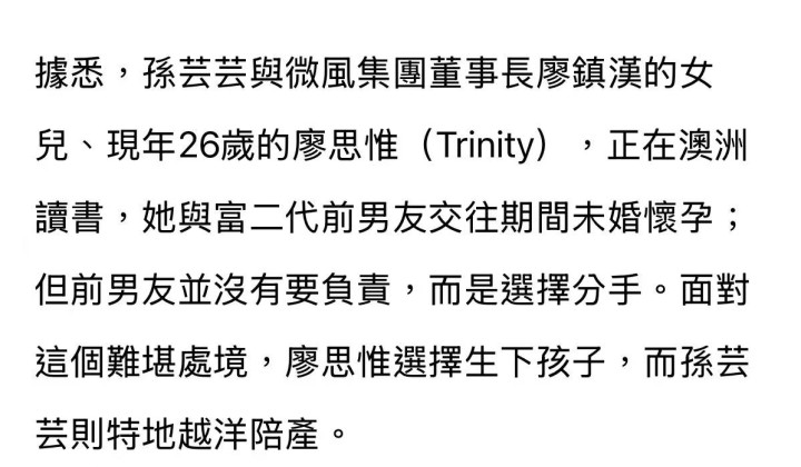 她26岁的爱女廖想惟,远赴澳洲低调产下宝宝,全程以单身状态待产。