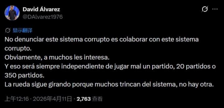 直播吧4月11日讯皇马TV主抓东谈主DavidÁlvarez更新社媒,抒发了对皇马1-1赫罗纳比赛中判罚的起火。