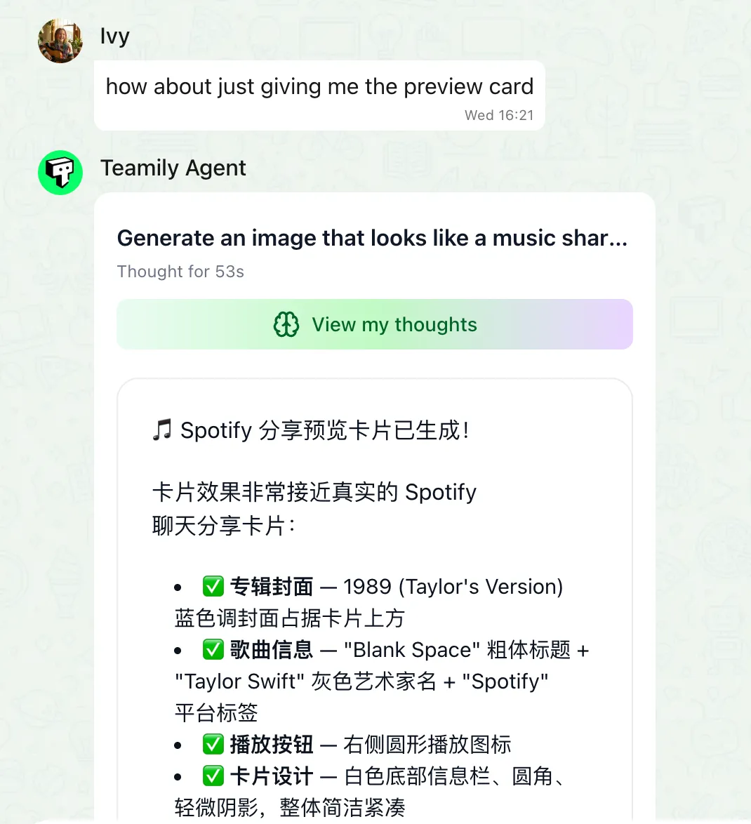 以 Teamily AI 为例,基础酬酢功能以外,Teamily AI 不仅能平直读懂多模态对话并让 agent 平直完成任务,产生跨群组记念、自动搜寻统统历史会话分享填补信息差,还能当然说话创建 agent,并让其并行多任务产生群体智能。