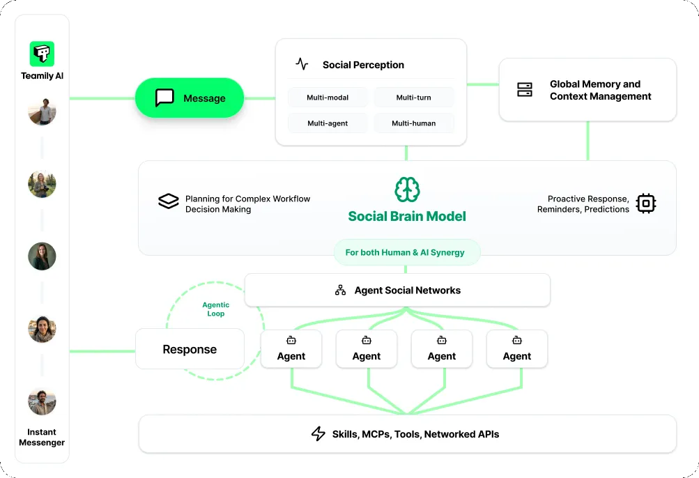 最典型的代表,是 Teamily AI。它是全球首个 AI 酬酢通用平台,行为一个 AI-native 的即时音讯诳骗,它的中枢是借助酬酢大模子开赴以及 agentic social network,不错让东谈主类和 AI 代理及时共存、互动(网页为主,暂无 APP 形态)。