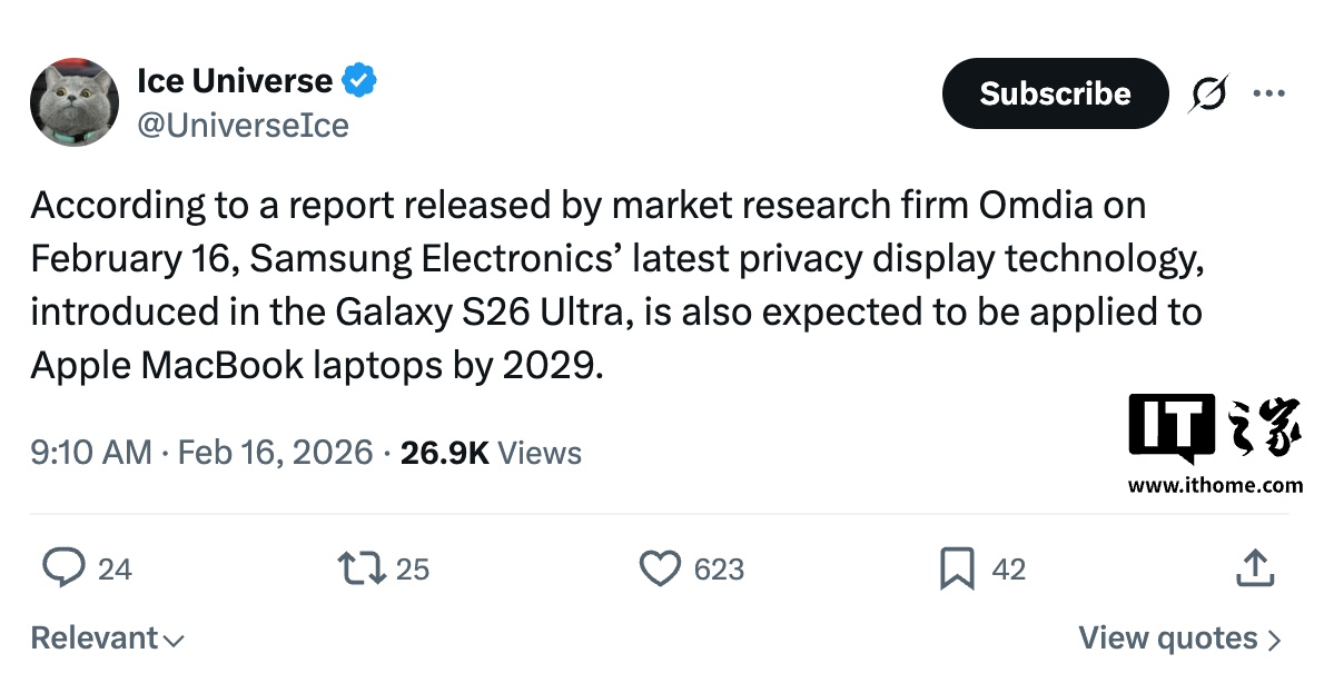 IT之家 2 月 16 日音讯,博主 @i冰天地 征引 Omdia 申诉,显现苹果公司对三星 Galaxy S26 Ultra 手机搭载的“防窥骄矜屏”特殊感酷爱,因此公司计较于 2029 年为 MacBook 居品线引入肖似的狡计。